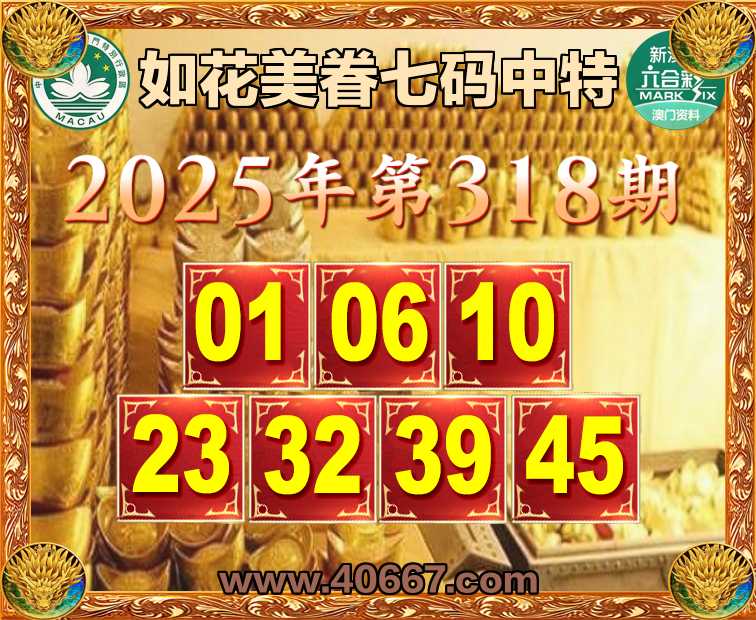 318期:【如花美眷】  ♣️七码中特 ♣️【01.06.10.23.32.39.45】开:06准上榜高手