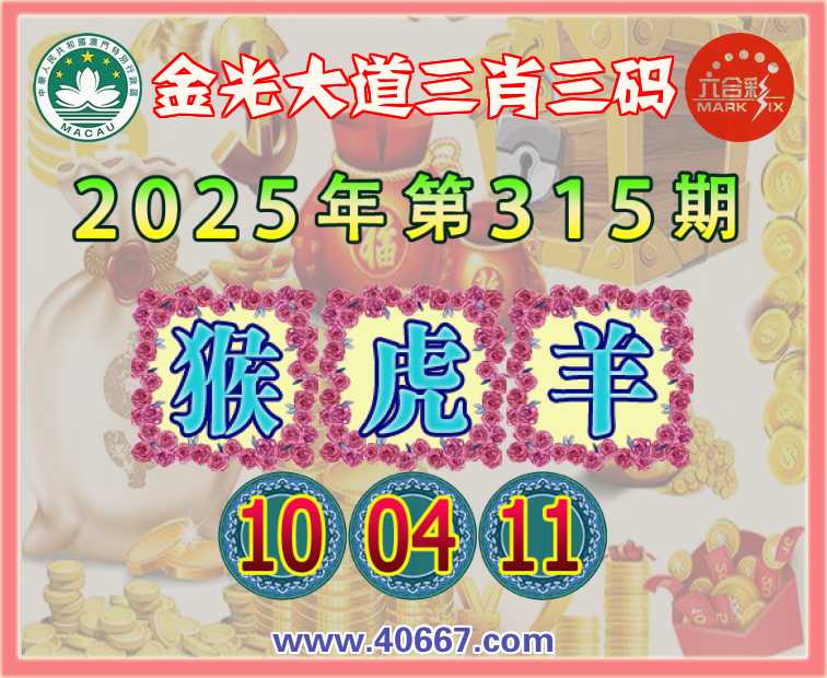 315期:『金光大道』 🥉三肖三码🥉【猴羊】【10.04.11】开:虎04
